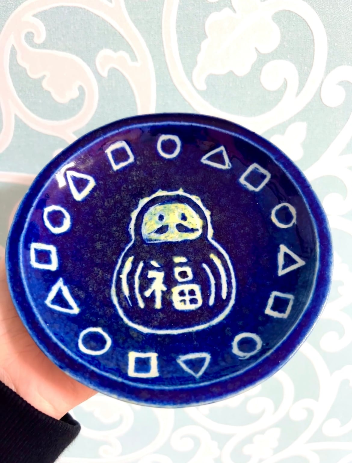 縁起のよいだるまを真ん中に 白ぬきで描きました。 瑠璃色が美しい 深いブルーが印象的なお皿です。 まるさんかくしかくをちりばめて 遊び心も演出。