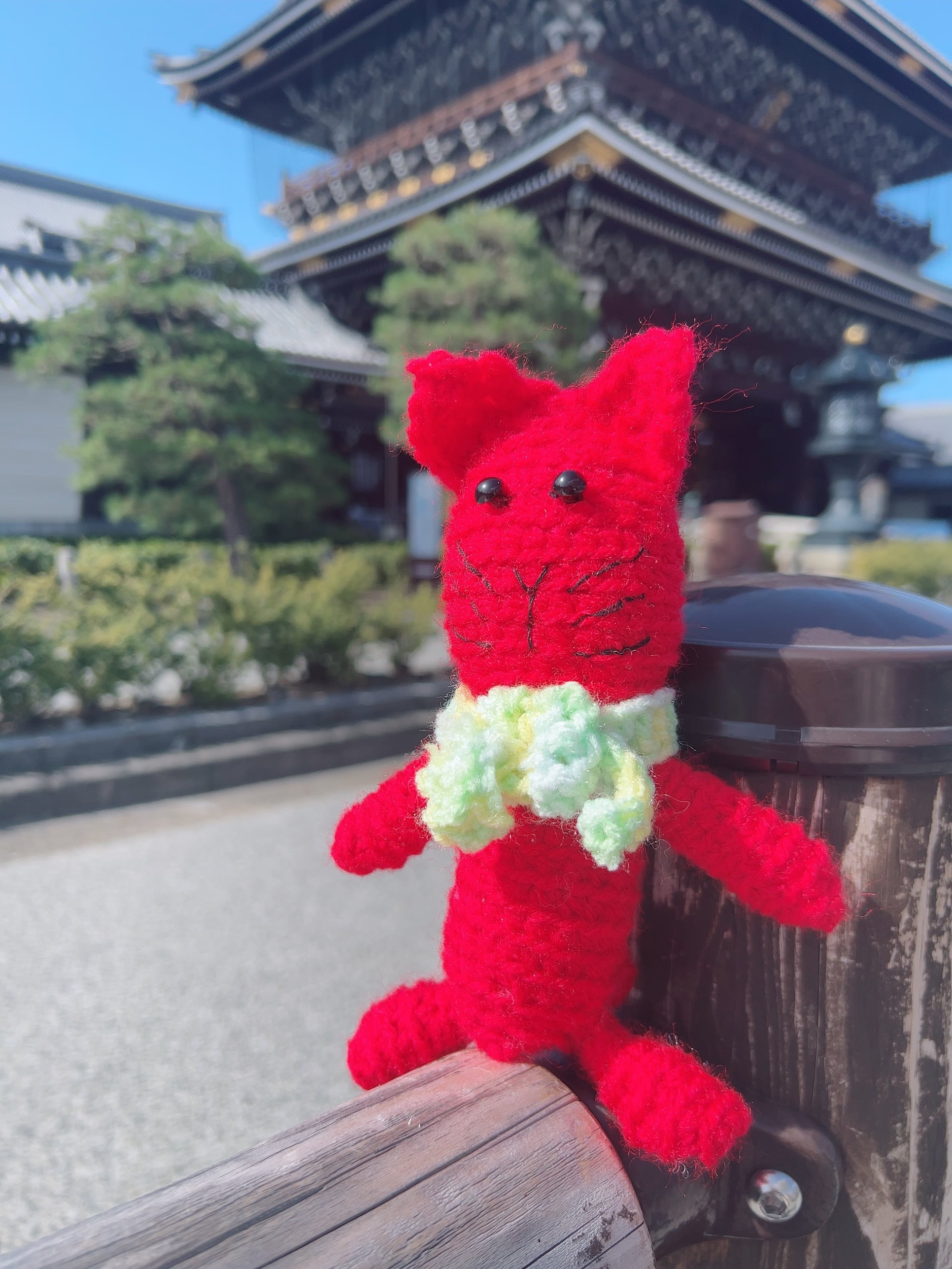 編みぐるみです 赤い毛糸の色がかわいい 癒しのネコです およそ たて25cm横10cm幅6cm